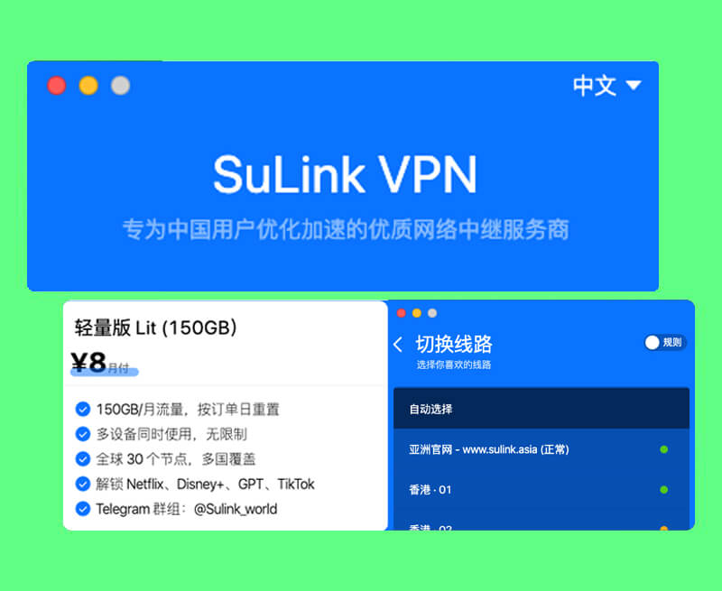 自从我有了 SuLink 以来,我就一直在使用它,我很喜欢它。这个 VPN 确实改善了我们的生活! support@sulink.asia 如使用期间遇到任何问题请联系 。