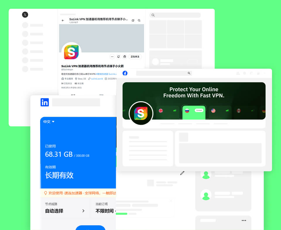 SuLink VPN 以极速连接、低延迟和现代科技设计为核心。无论是跨境访问还是流媒体解锁,都能以简洁高效的方式突出你的核心优势。